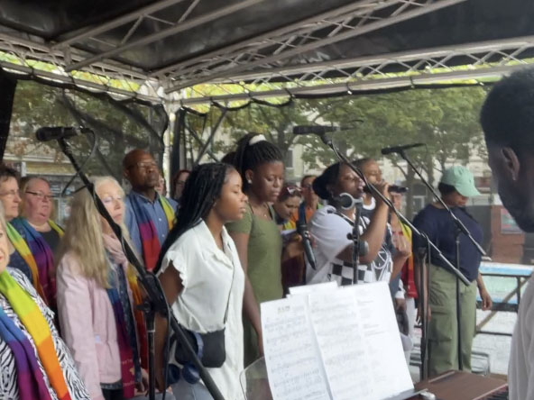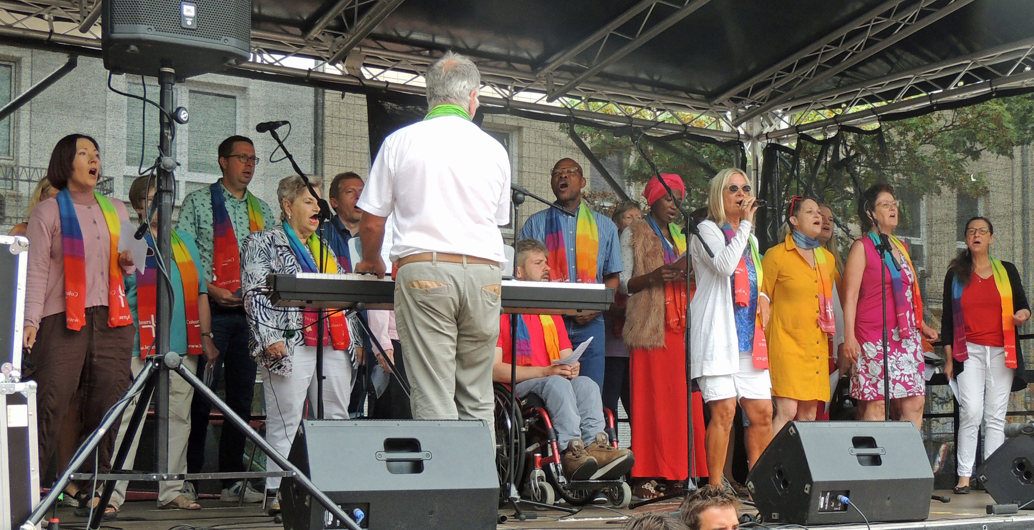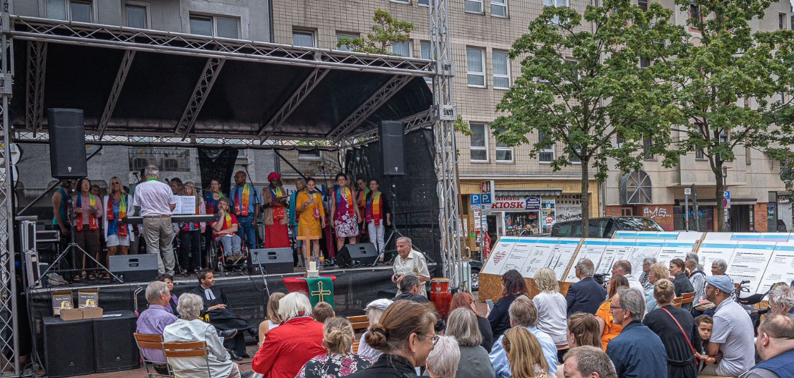 Um 10.00 Uhr beginnt das Brunnenfest in Gaarden wieder mit dem Gospel-Gottesdienst auf dem Vinetaplatz. Bei immer sehr gutem Wetter open Air gibt es ein quirligen Treiben rund um die Bühne und die Düfte von den Falavel-Ständen machen schon hungrig auf die Mittagszeit. Aber vorher singt der Gospelchor und Amour de Dieu im Gottesdienst von 10 bis 11 Uhr und nach der offiziellen Eröffnung des Brunnenfestes um 11.00 Uhr gibt es noch einige weitere Gospel von beiden Gruppen zu hören.